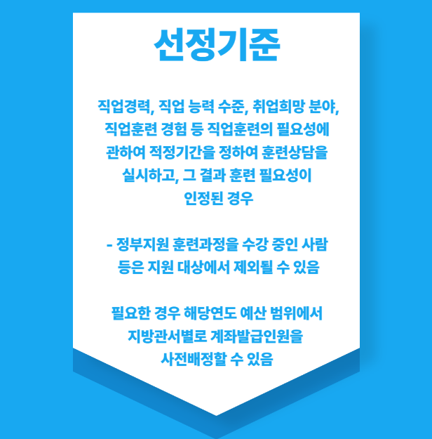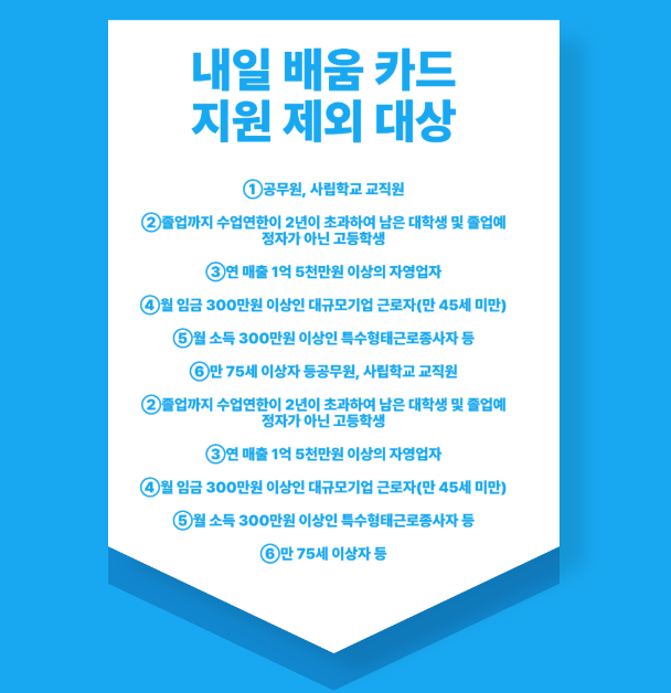 현직 공무원, 사립학교 교직원, 졸업예정 학년이 아닌 고등학교 재학생, 졸업까지의 수업연한이 2년을 초과하여 남은 대학 재학생, 4억원 이상의 자영업자, 월 임금 300만원 이상인 대듀모 기업 종사자(45세미만), 월 평균 소득 500만원 이상인 특수형태근로 종사자 등은 제외됩니다.