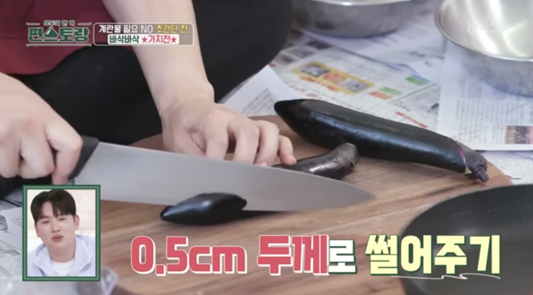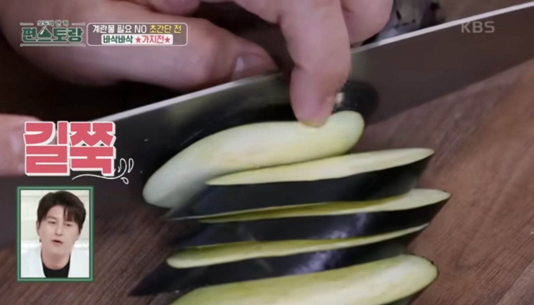 가지는 얇게 자르지 말고 대략 0.5cm 두께로 자르는 것이 좋아요. 그리고 길쭉하게 어슷하게 썰어 주는게 좋습니다.