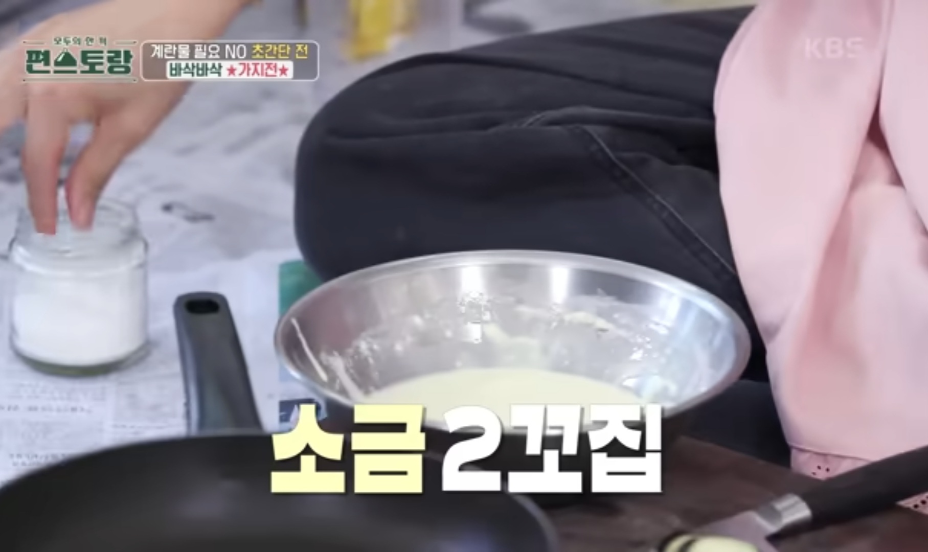 이 반죽물에 소금 두꼬집을 넣어 줍니다.