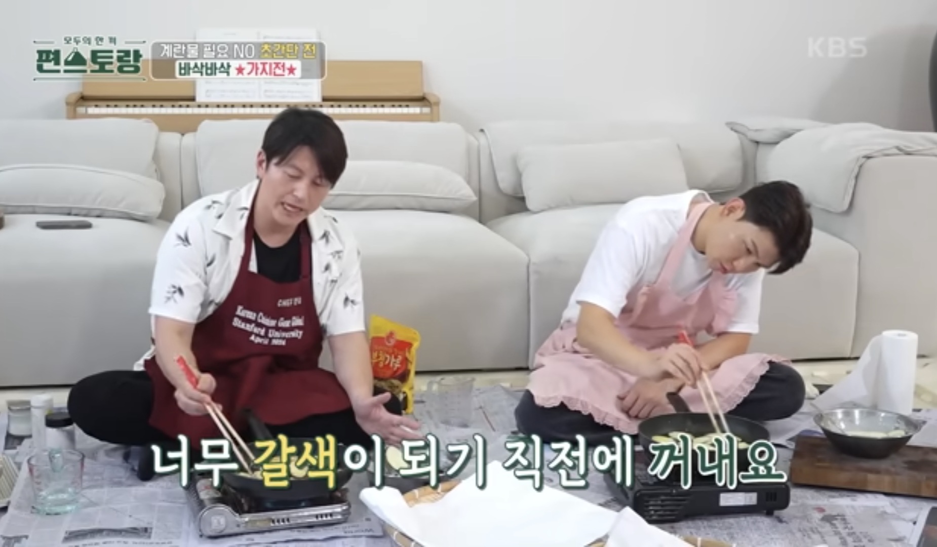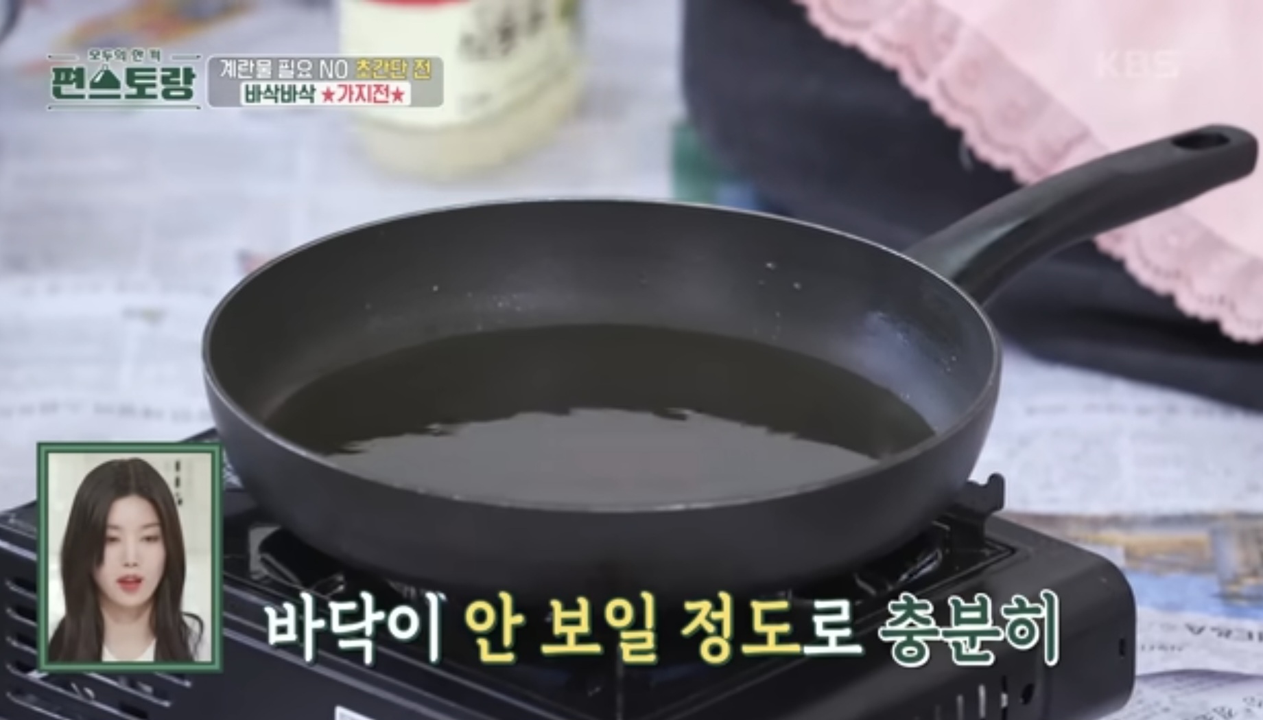 기름은 바닥이 다 덮일 정도로 충분히 부어주고 불은 중불로 줄여줍니다.