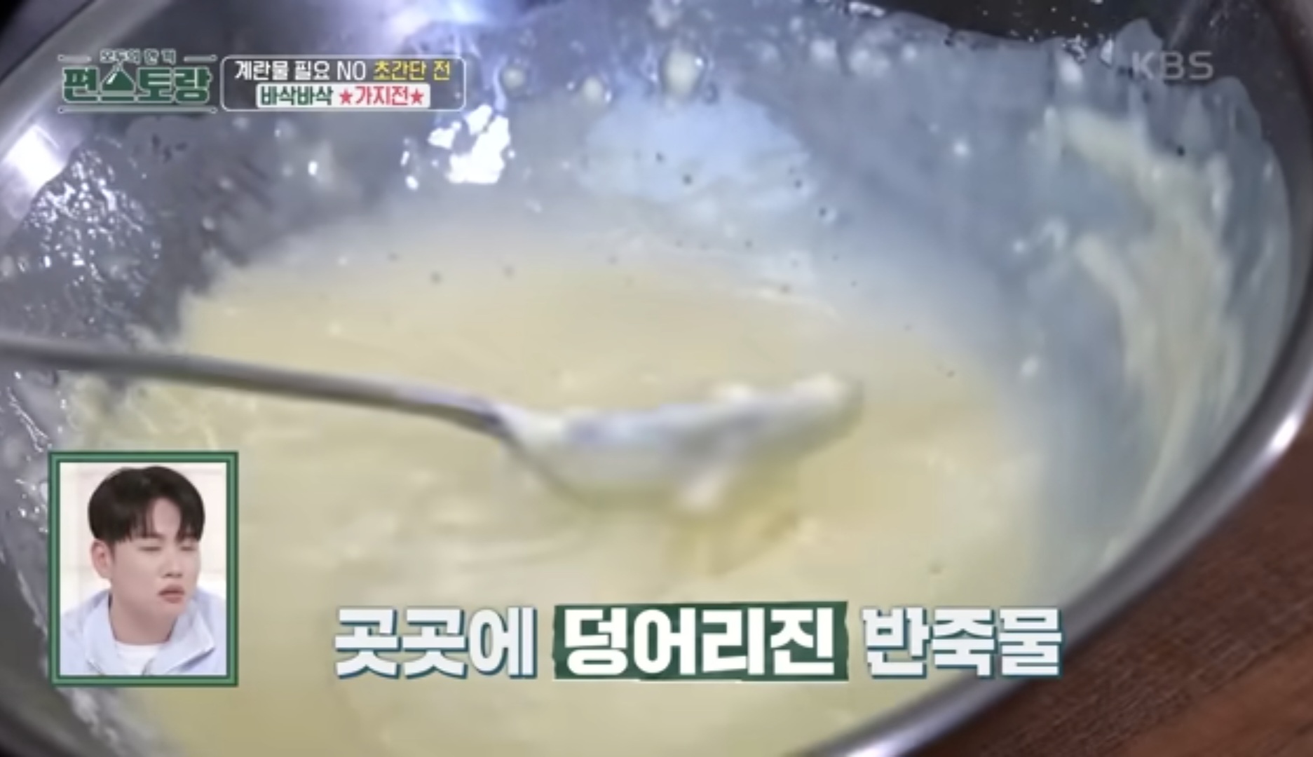 반죽물을 오래 저으면 빵반죽 할때처럼 쫀득해지기 때문에 바삭한 식감을 위해서는 대충 저어서 섞어 주어야 해요.