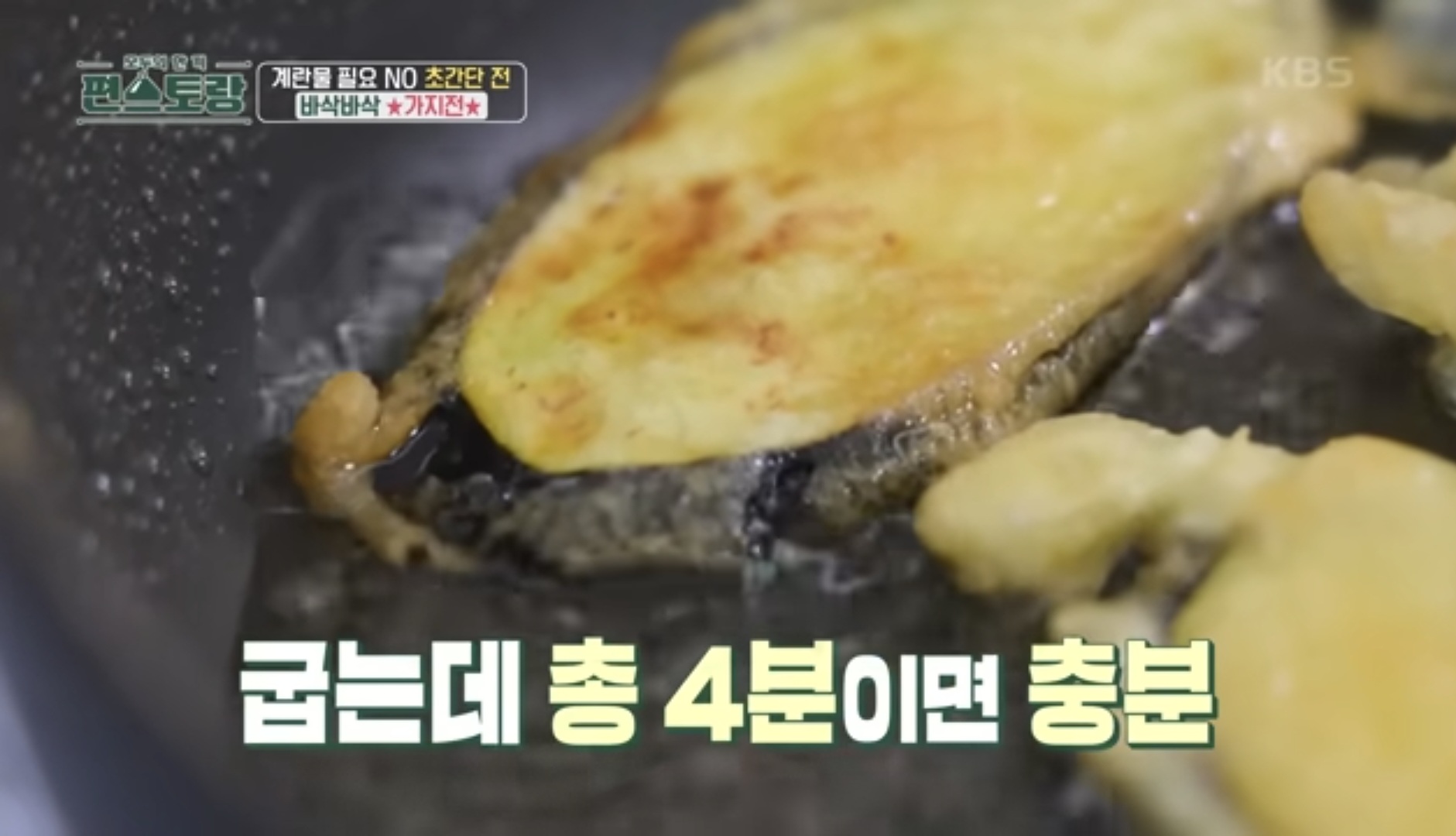 자주 건드리면 튀김옷이 분리되기 때문에 한쪽이 익을동안 그대로 두어야 더 바삭한 가지전을 만들 수 있어요.