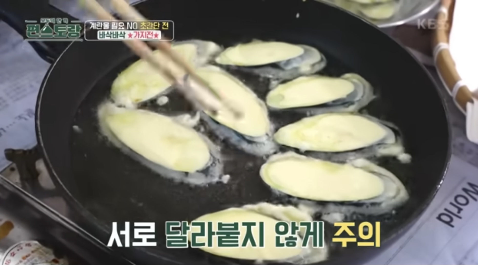 후라이팬에 넣을때 너무 많은양을 한번에 넣지 않고 서로 달라붙지 않게 주의합니다. 그래야 튀김옷이 그대로인 바삭한 가지전이 됩니다.