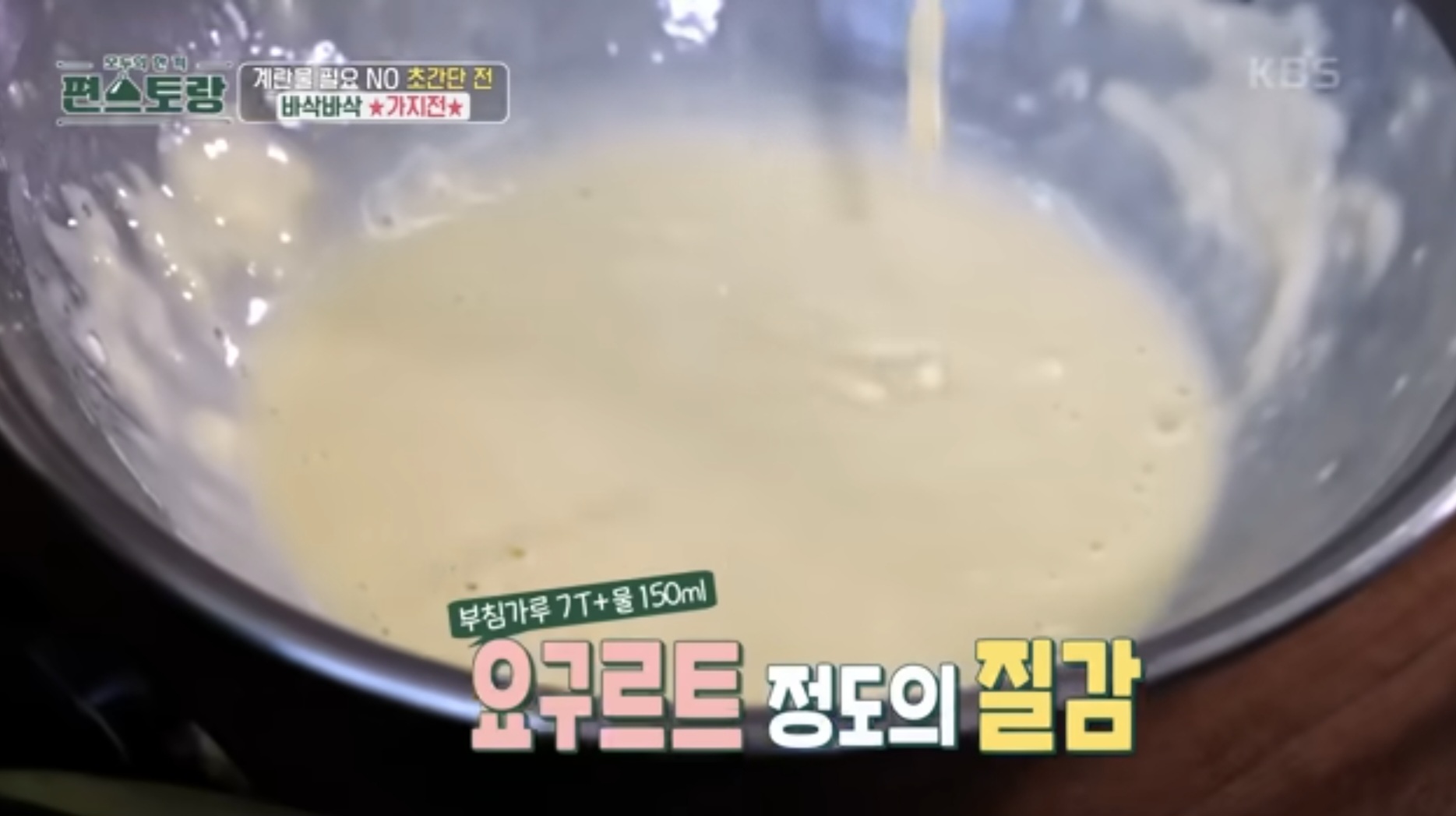 부침가루 7T와 물 150ml를 섞어준 반죽물은 수저로 떠서 떨어뜨려보면 요구르트 정도의 질감이 됩니다.