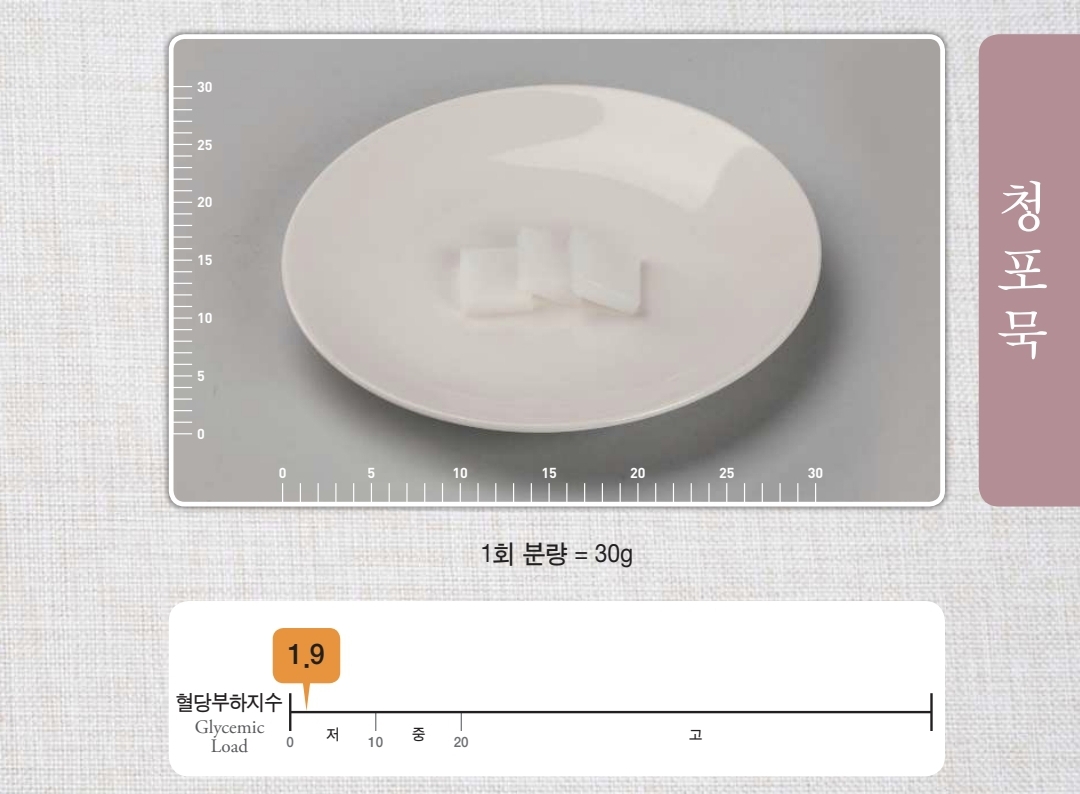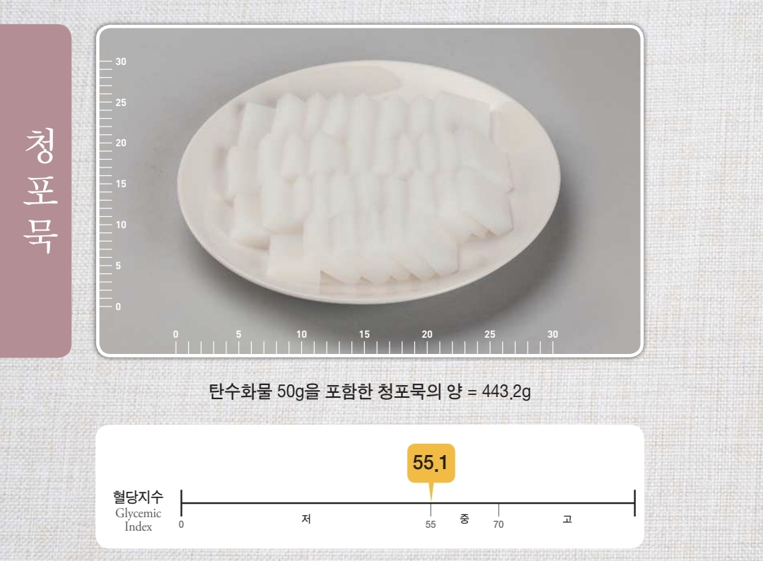 청포묵은 중 혈당지수에 속하지만, 동시에 저 혈당부하지수에 속하기 때문에 1회 섭취량에 주의하여 먹으면 혈당 변화에 큰 영향을 미치지 않습니다.