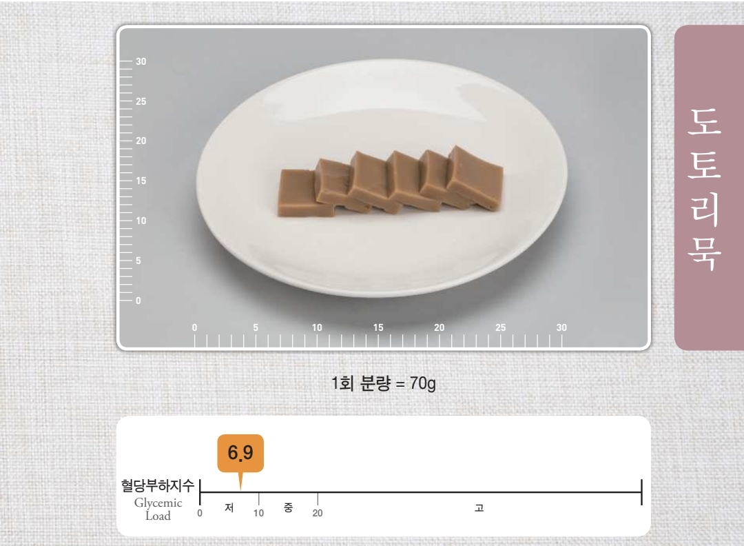 도토리묵은 고 혈당지수에 속하지만, 동시에 저 혈당부하지수에 속하므로 섭취 시 1회 분량에 주의하여 먹도록 합니다.