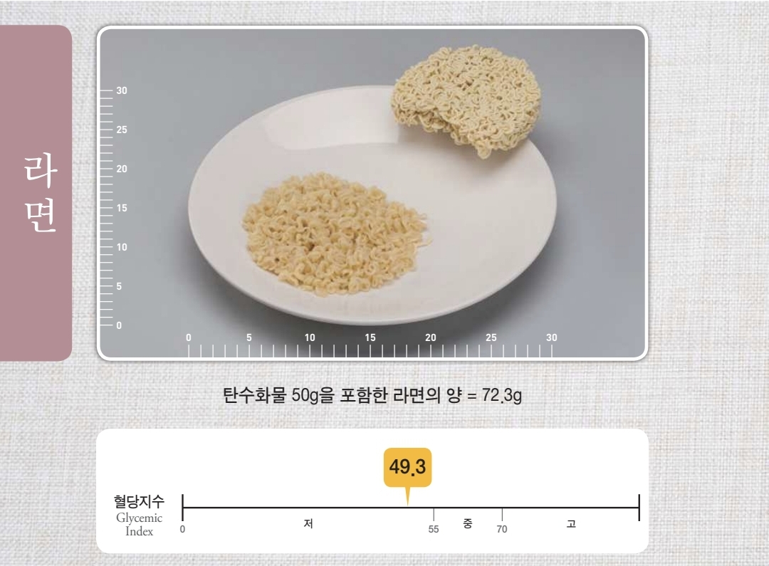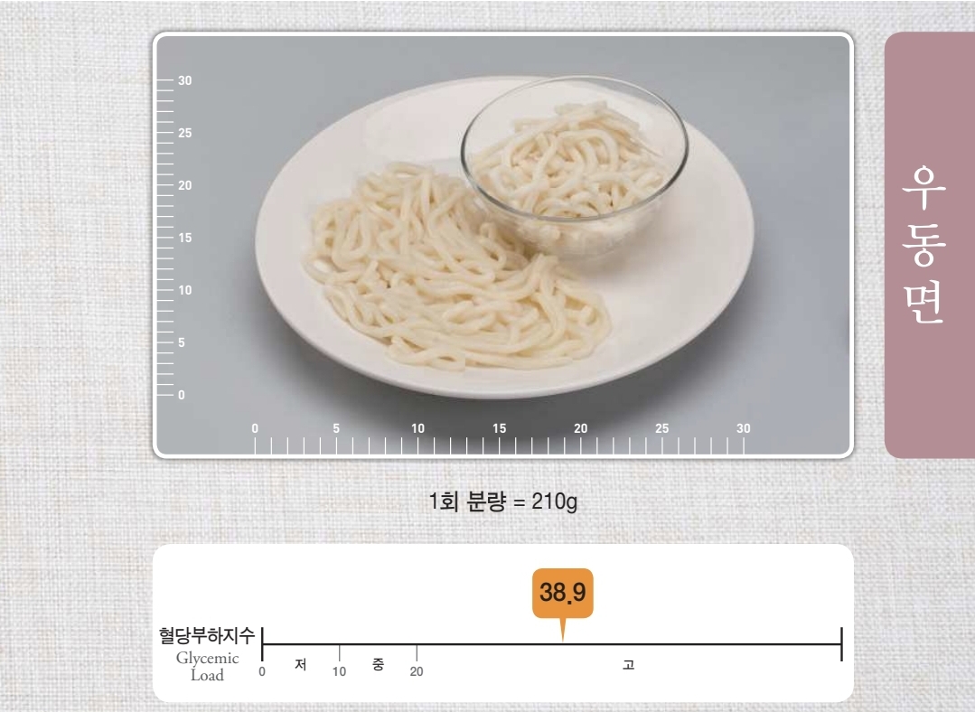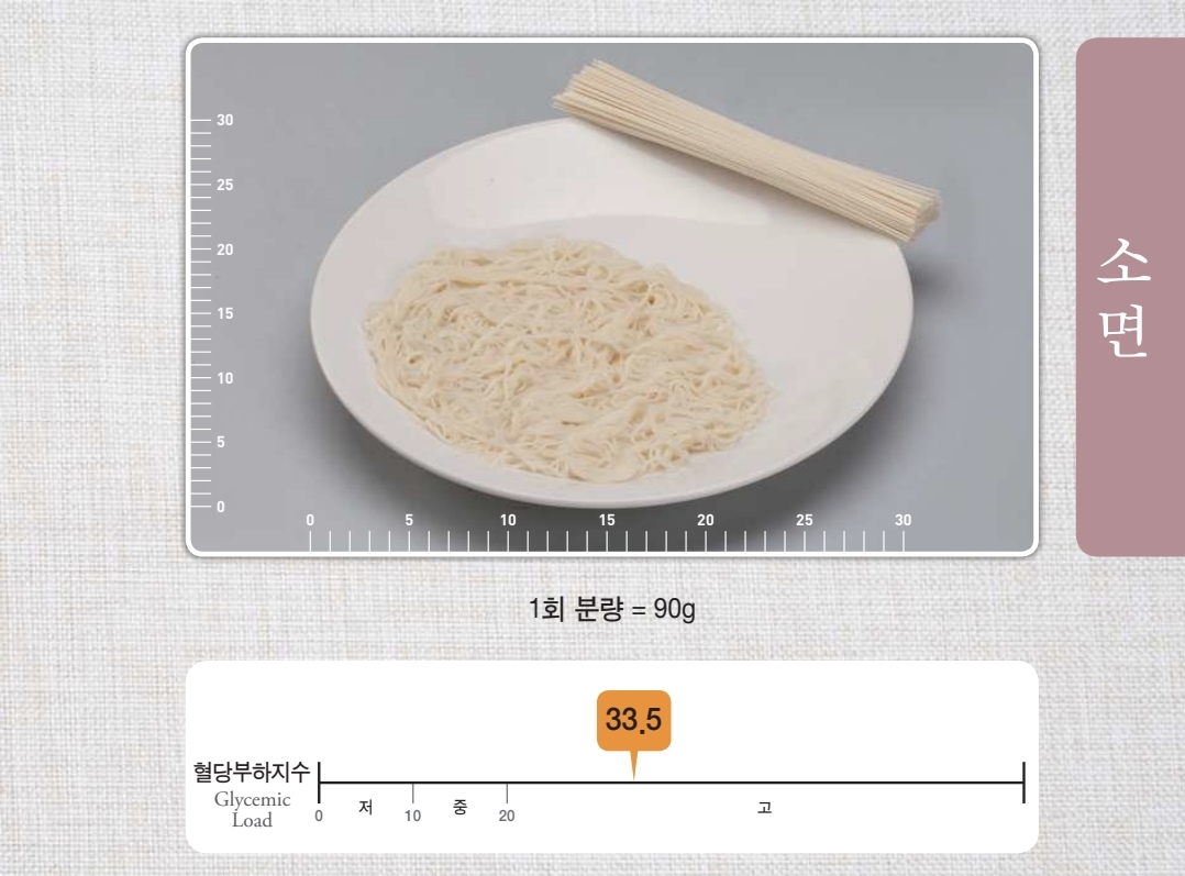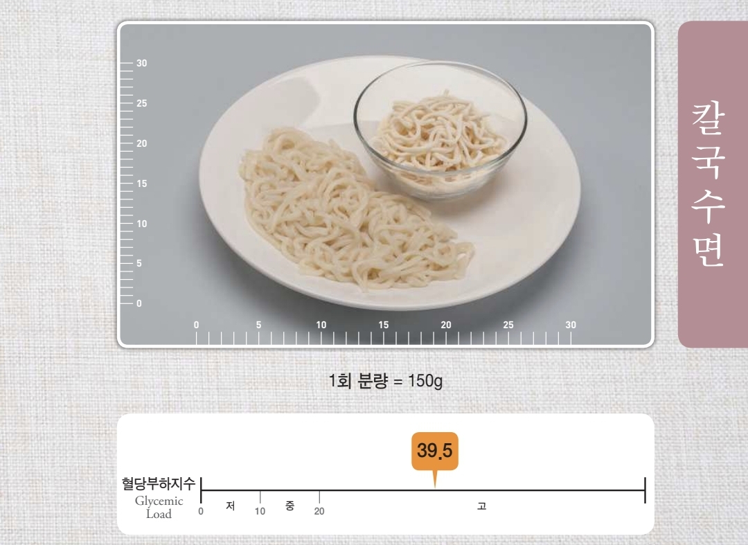 면류는 1회 분량이 많아 고 혈당부하지수에 속하므로 호박, 표고 버섯등의 식이섬유와 계란, 소고기 등의 단백질과 함께 섭취하여 혈당지수를 낮출수 있습니다.