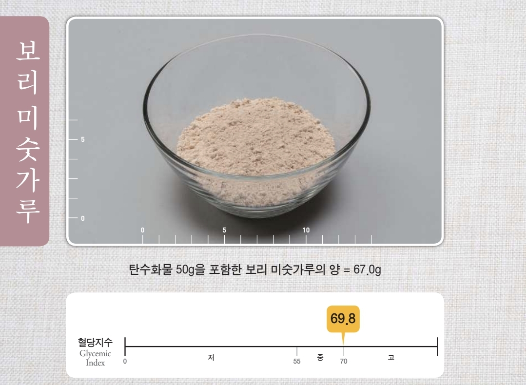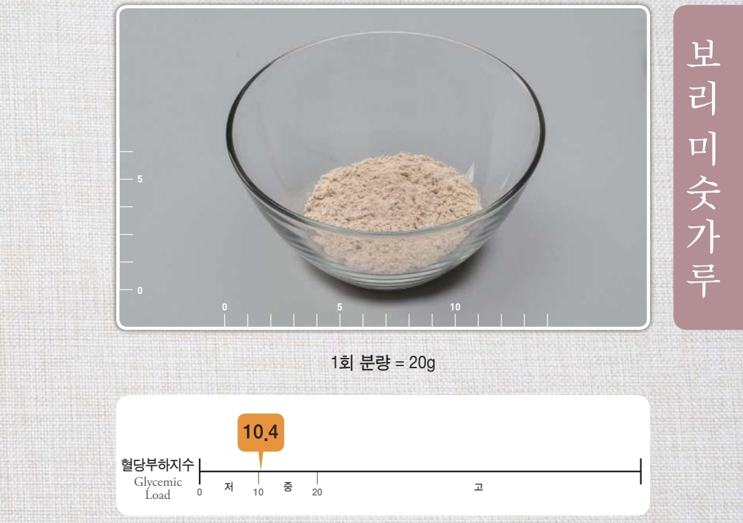 ◈ 보리 미숫가루를 만드는 과정에서 볶음처리와 분쇄에 의해 보리밥 보다 혈당지수가 상승합니다. 그러나 보리밥에 비해 섭취량이 적어 혈당부하지수는 낮은 편입니다.