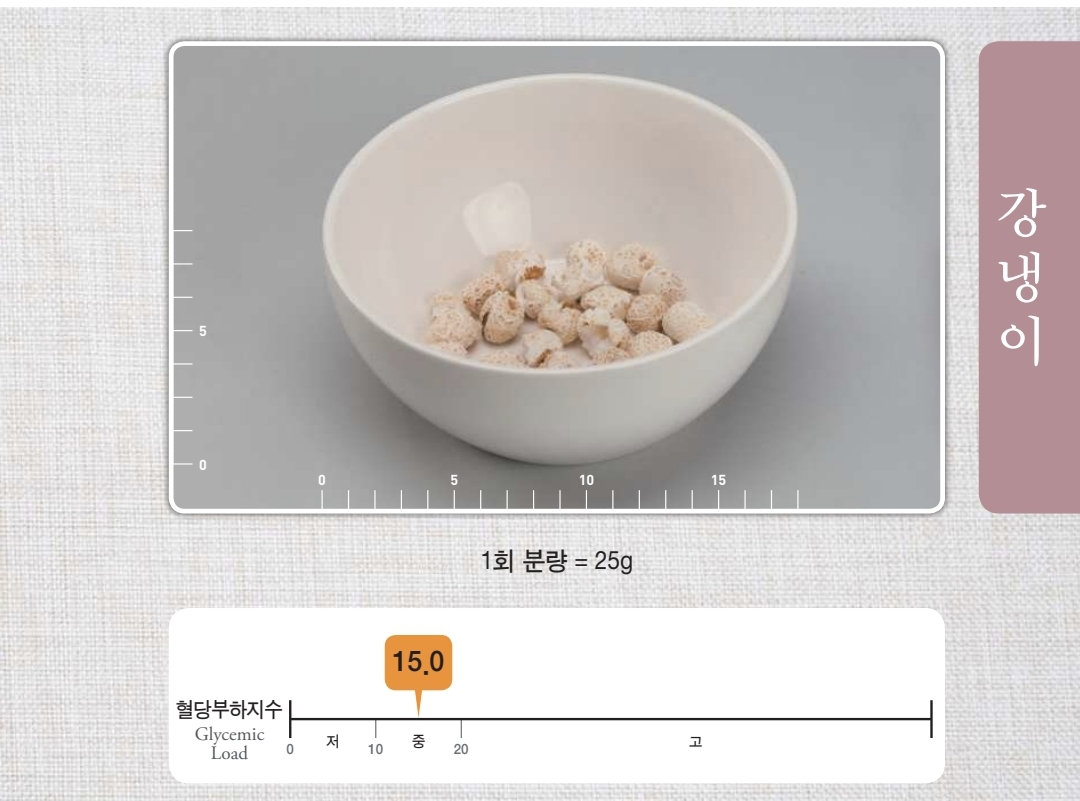 ◈ 강냉이는 중 혈당지수와 중 혈당부하지수에 속합니다. 그러나 간식으로 섭취 시 1회 분량보다 많은 양을 먹게 되므로 섭취량 조절이 필요합니다.