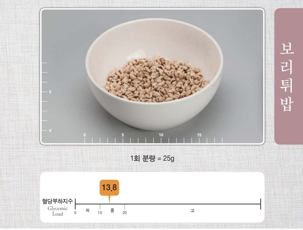 ◈ 팽화는 혈당반응을 증가시키는 조리방법의 하나로 보리밥에 비해 보리튀밥의 혈당지수는 높으나 1회 분량이 적어 혈당부하지수는 낮다. 보리튀밥의 경우 섭취량을 고려해야 합니다.