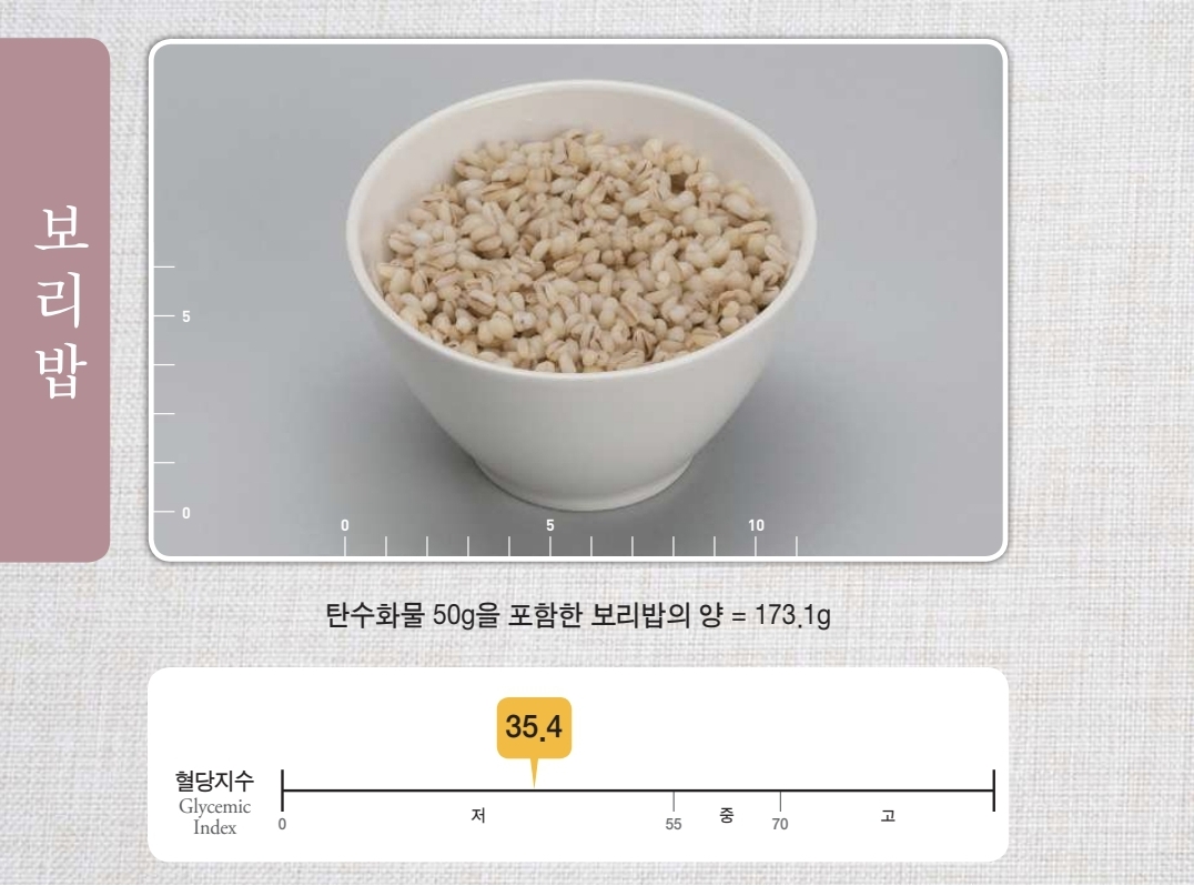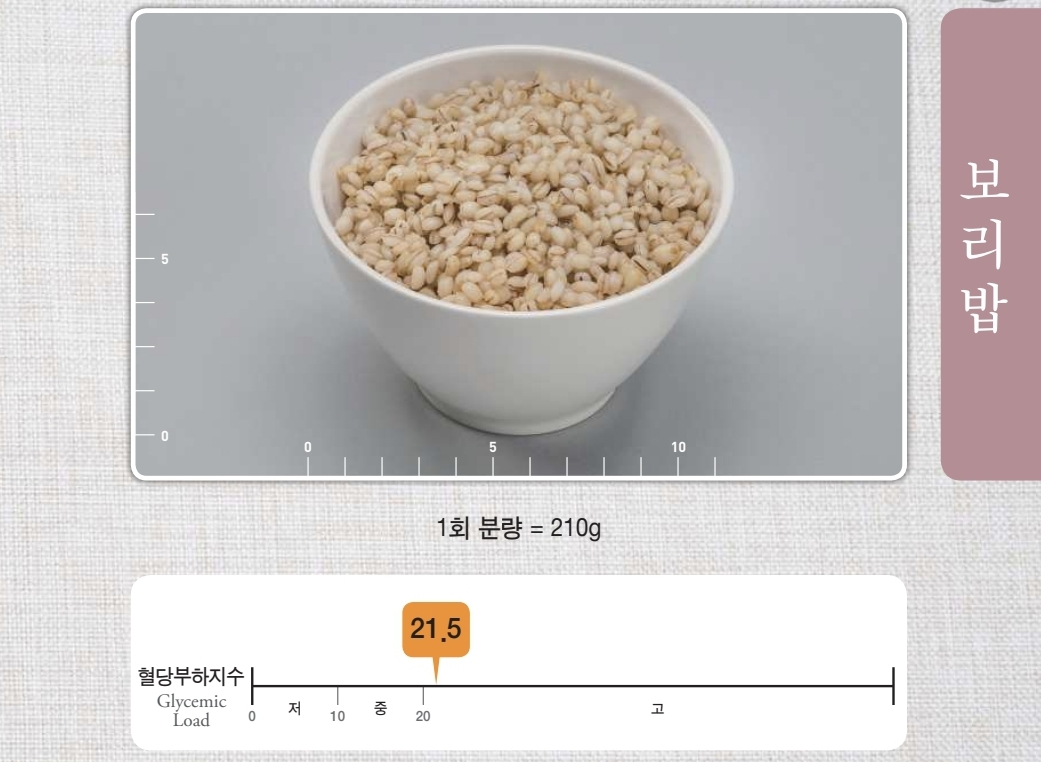 ◈ 보리밥은 저 혈당지수이나 고 혈당부하지수에 속하므로 어육류나 채소와 같이 섭취하면 혈당반응을 늦출 수 있습니다.
