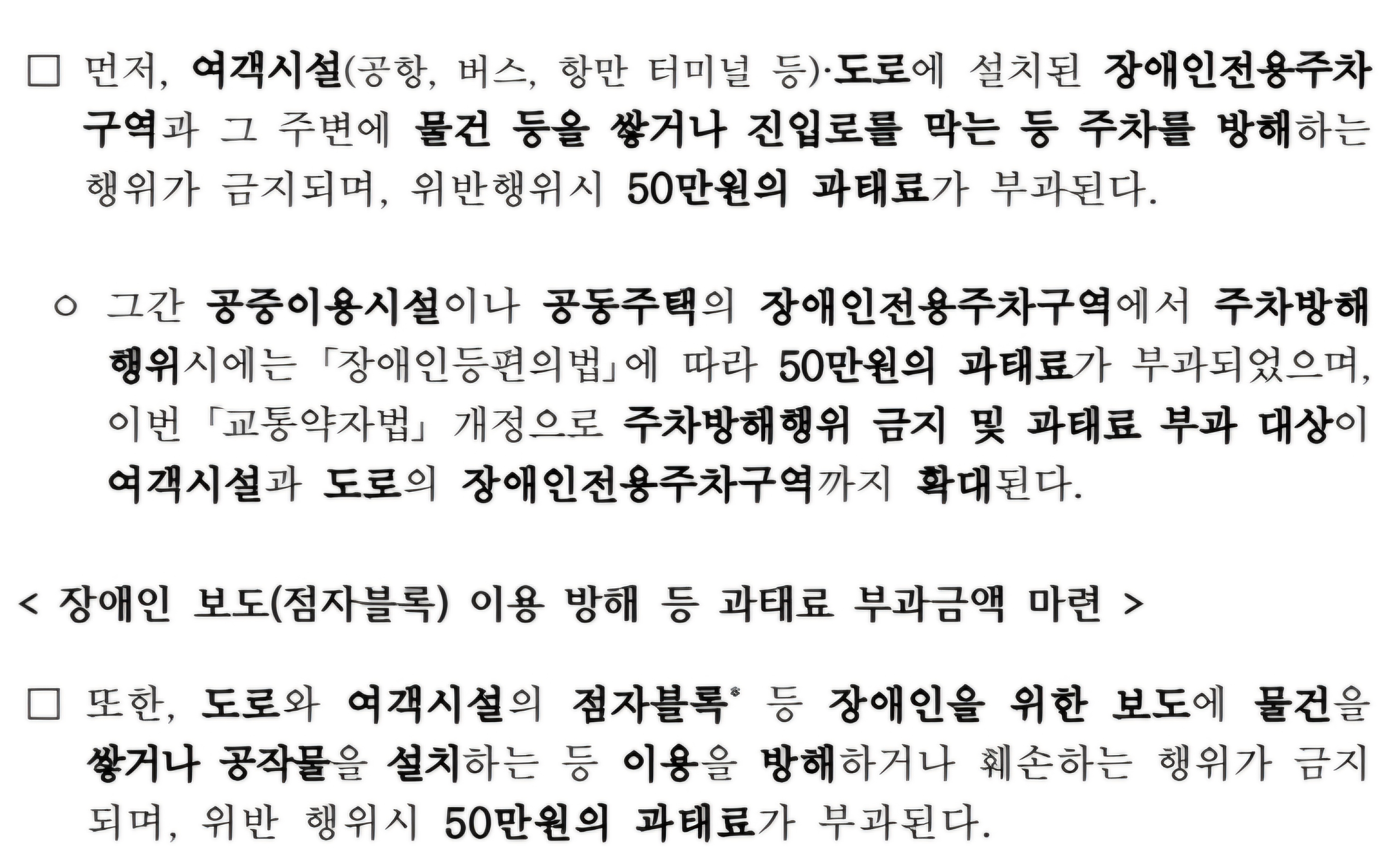 - 과태료 인상: 장애인주차구역을 불법으로 점유하거나 방해할 경우, 과태료가 50만원으로 인상되었습니다.