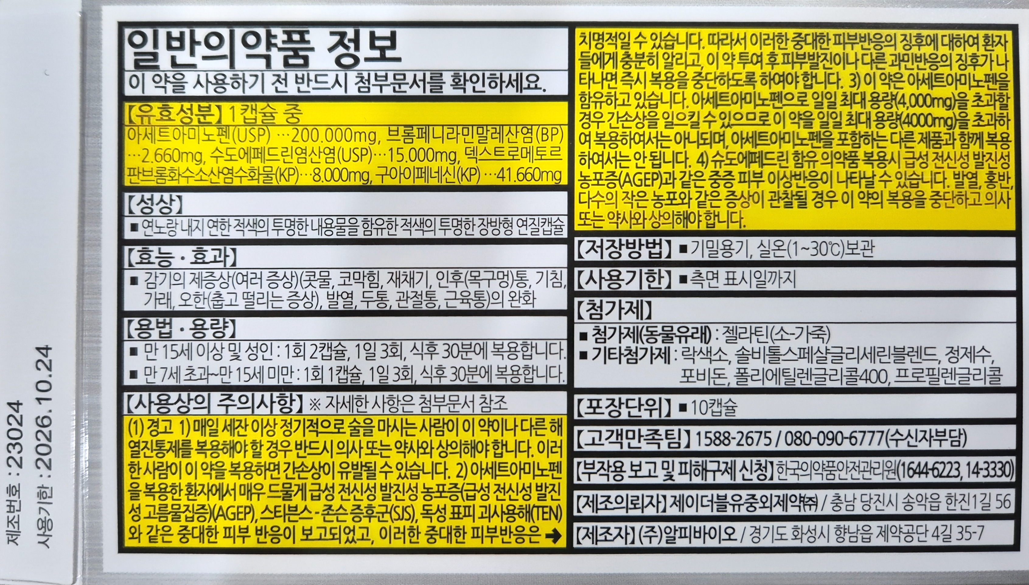종합감기약 화콜 c의 성분을 보니 아세트아미노펜이 포함되어 있는 걸 확인할 수 있어요.