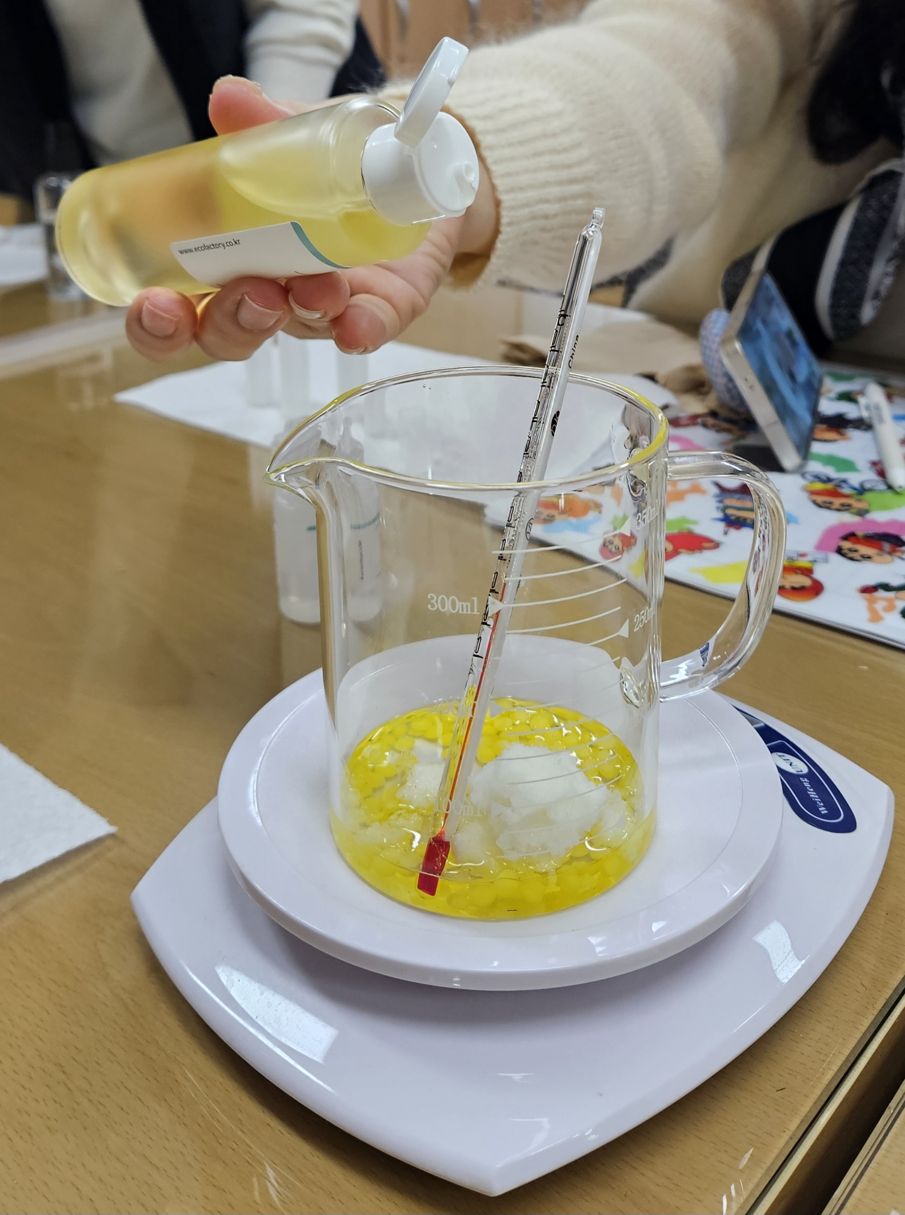 3. 색소와 천연 성분 추가: 재료가 다 녹은 후에 비타민 E 오일, 천연 색소, 에센셜 오일을 추가합니다.