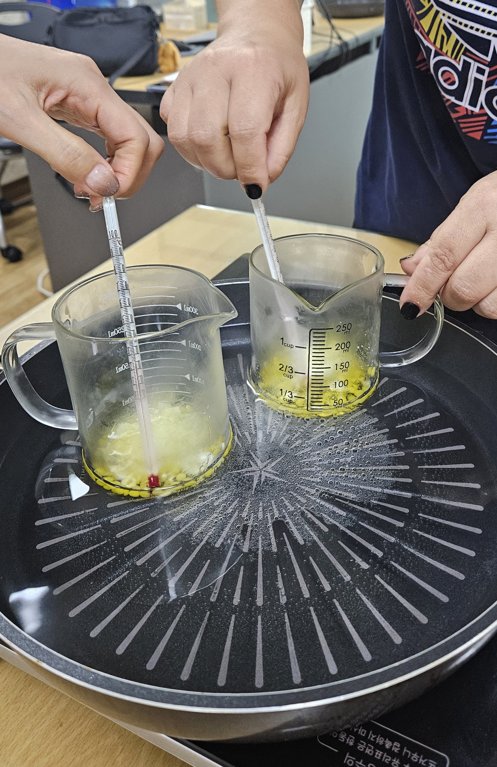 온도계를 이용해 70도가 넘지 않도록 하며 유리막대로 저어 빨리 녹여줍니다.